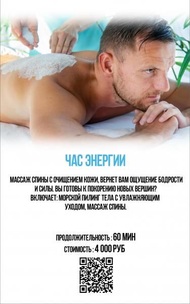 Час энергии 60' – 4000 руб (морской пилинг тела, увлажнение, массаж спины)